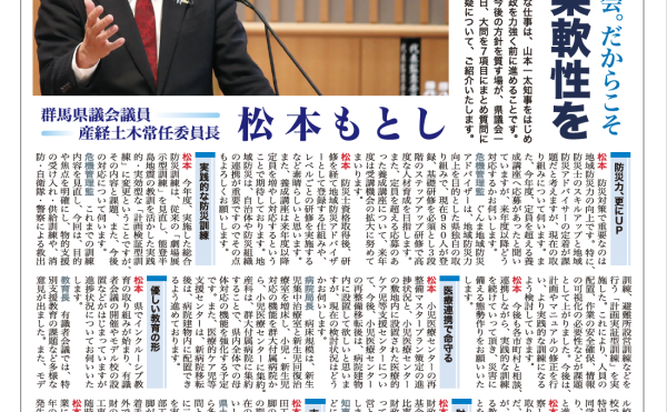 2期目のスタートで危機管理を担当する特別委員会を選択したのは、これまでの活動の〝延長線〟です。県民の命に関わる安全確保の態勢を整え、群馬県の優位性を生かした首都圏を支える取り組み、災害レジリエンス・ナンバー1の実現などを、議会人のライフワークとして進めます。